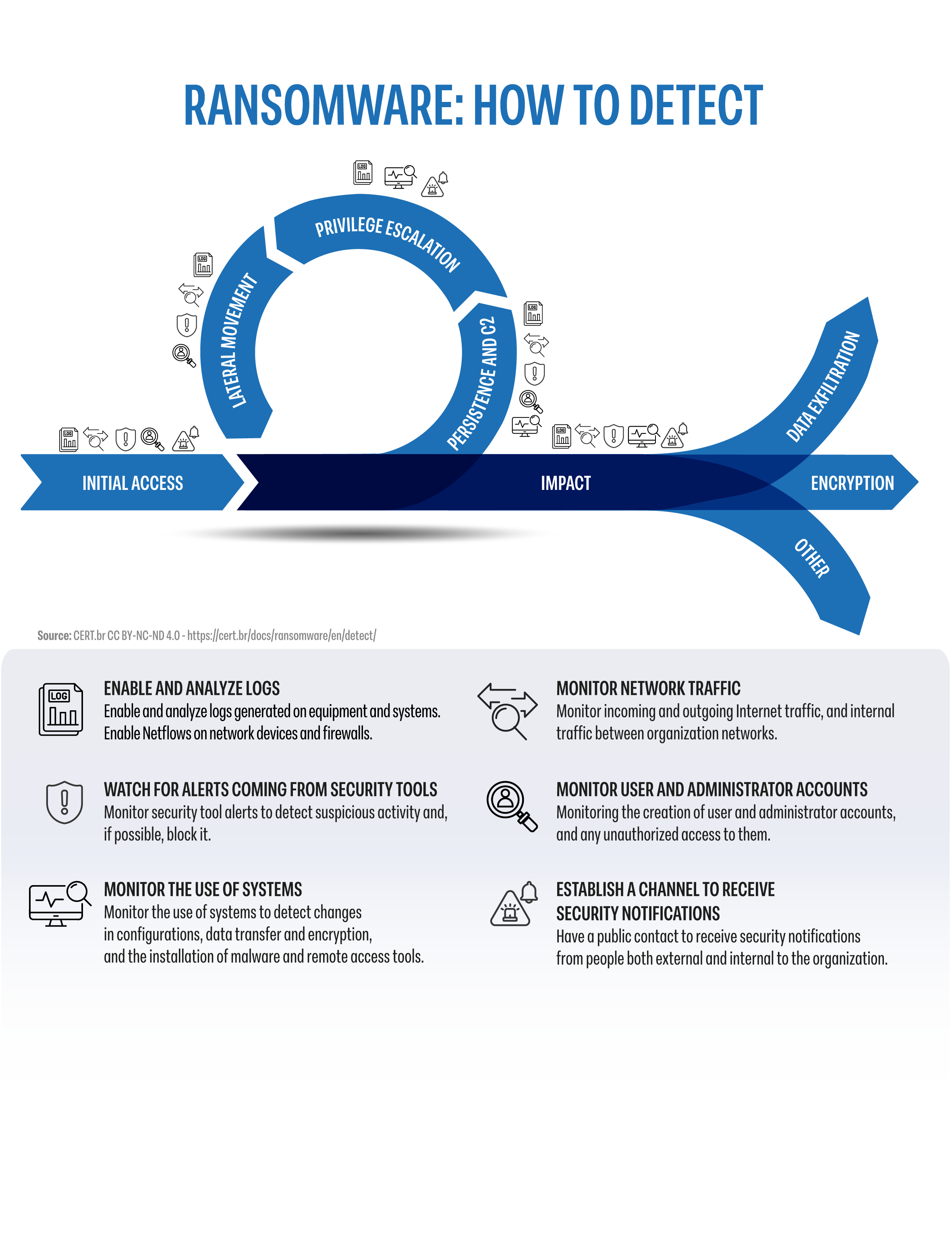 This document presents ways to detect ransomware attacks at different stages, in different ways, and with varying levels of detail. The earlier the detection occurs, the less impact it will have on the organization and, consequently, less effort is required for response.