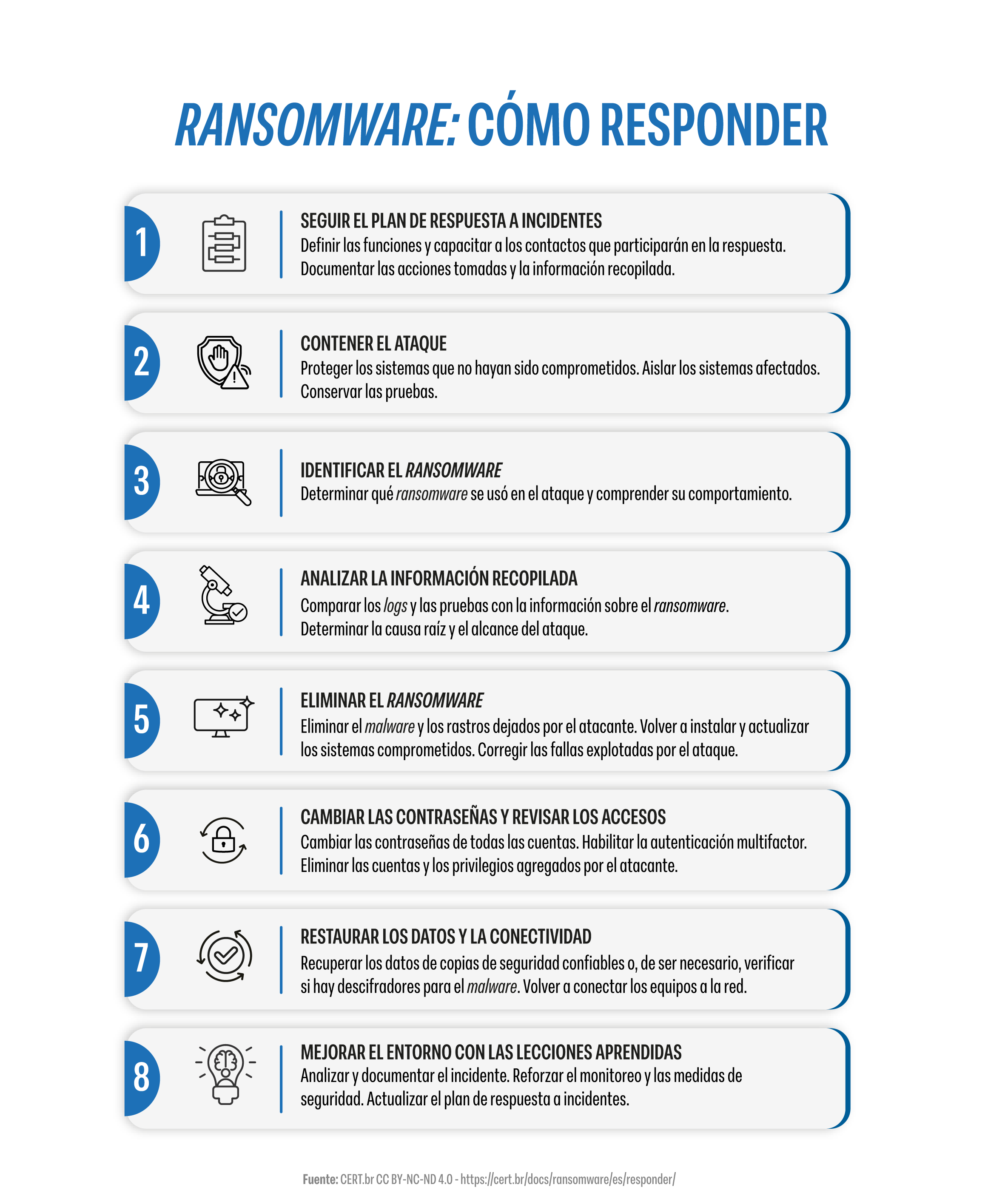 Este documento detalla los pasos mínimos para responder a un ataque de ransomware y describe cómo contener su propagación, eliminar la presencia del atacante, erradicar la causa raíz de la intrusión, restaurar el entorno y reanudar la operación normal.